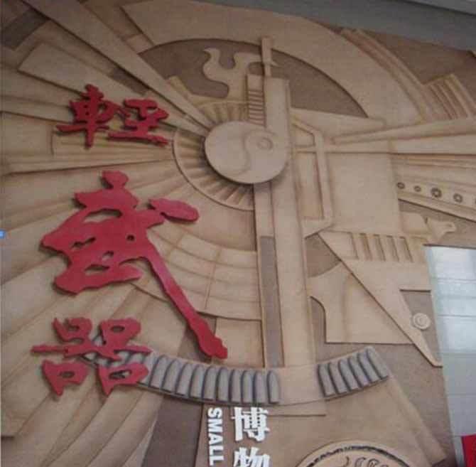 走进轻武器博物馆,映入眼帘的是巨大的浮雕:形似95步枪的造型,枪口处站立一只和平鸽。浮雕墙上位于四个方位的中国传统神兽图腾分别为青龙、白虎、朱雀、玄武,代表镇守四方、保卫家国。这一看似“矛盾体”的组合以“轻武器维护世界和平”的理念悄然“叩开”了这座珍藏着古今中外数千年军事宝藏之库的大门。