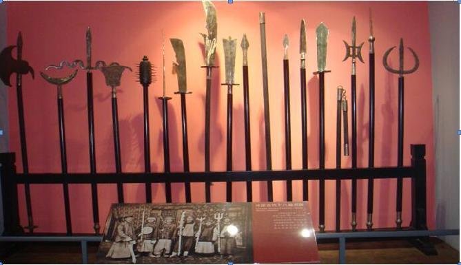 冷兵器展厅中另一个引人瞩目的兵器是刀、枪、剑、戟、斧、钺、钩、叉等十八般武器。“根据历史考究,十八般武艺为历史流传,而十八般兵器则为戏说。”讲解员告诉笔者,十八般兵器泛指中国不同朝代流传下来的诸多兵器。随着历史、地域、流派的不同,其种类和形状也不尽相同,因而衍生出了传奇般的“十八般兵器”。