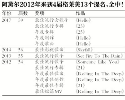 Adele两张专辑《21》和《25》均拿下格莱美所有提名,其中《21》在2012年包揽6个奖项。