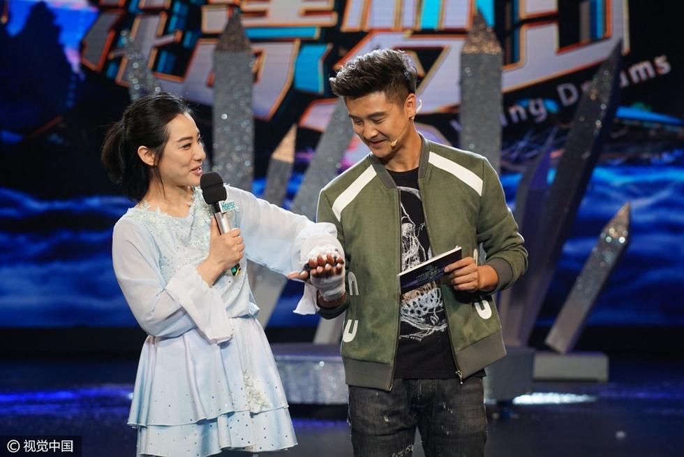 2017年02月15日,上海,刘璇产子后复出某真人秀节目与好友田亮同框,田亮彩排时手掌受伤用白纱布包扎,刘璇倍感亲切掌心对掌心安抚田亮。