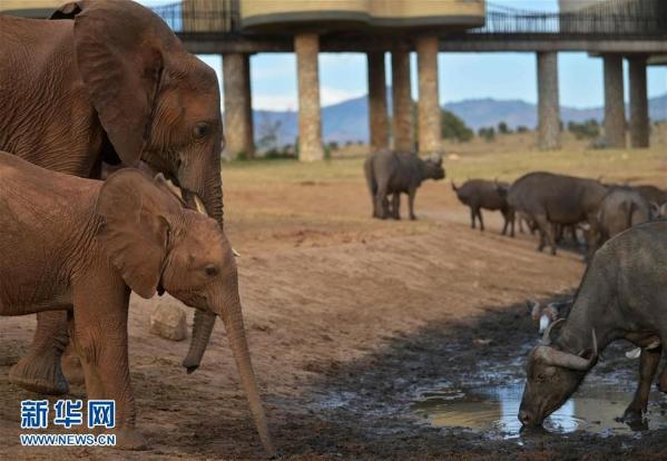 2月16日,在肯尼亚西察沃国家公园,大象和水牛在水塘里喝水。日前,肯尼亚野生动物保护局对生活在肯尼亚与坦桑尼亚交界处4.8万多平方公里土地上的野生哺乳动物进行监控,收集大象等哺乳动物的数量、迁徙路线以及水源和草场资源的相关数据。新华社/法新
