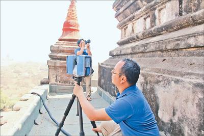在缅甸蒲甘他冰瑜佛塔的一处平台上,中国专家组成员正在进行勘测。 |