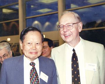 杨振宁和米尔斯合影。“杨振宁-米尔斯非阿贝尔规范场”发表的时间早于宇称不守恒,但等杨振宁因宇称不守恒名声大噪而获诺奖时,“杨振宁-米尔斯非阿贝尔规范场”尚未被人重视。