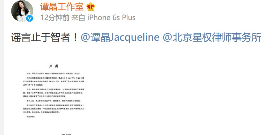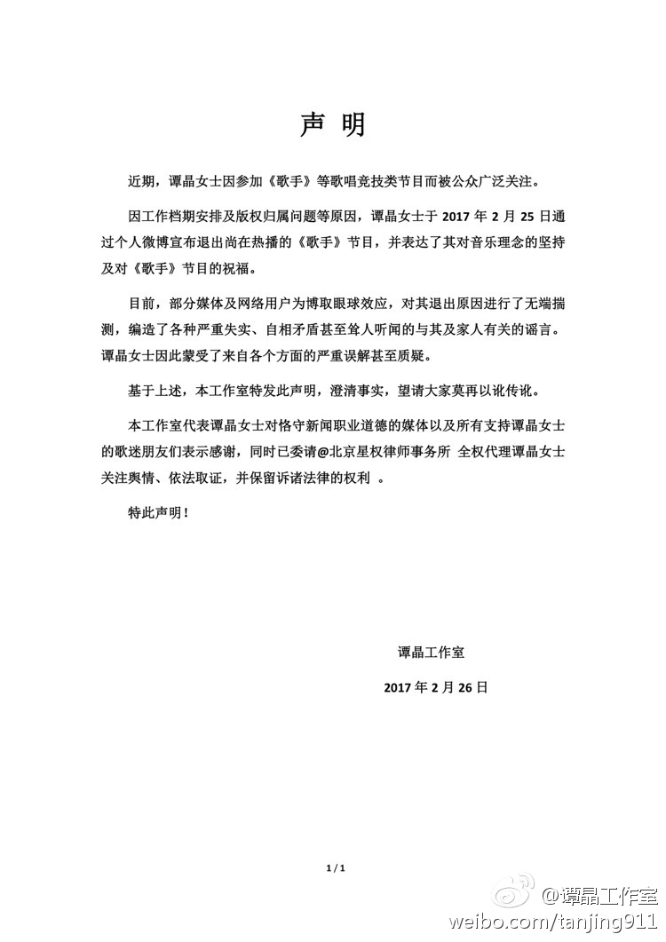 今天,谭晶工作室发表声明,称退出的原因是工作档期安排和版权归属问题,以澄清网上的不实传言。