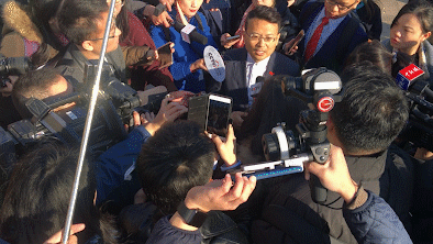 2017年3月5日,第十二届全国人民代表大会第五次会议在北京人民大会堂开幕。一位代表在人民大会堂外遭媒体“围堵”。