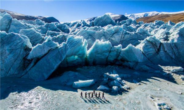 普玛江塘边防派出所官兵在岗布冰川下巡逻(1月19日摄)。 新华社记者 普布扎西 摄