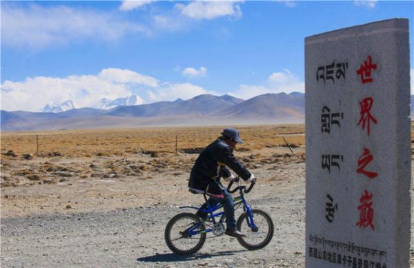 一名当地村民骑车经过普玛江塘乡村头(3月10日摄)。 新华社记者 晋美多吉 摄
