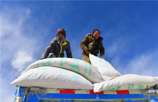 普玛江塘乡查布村村民在乡政府所在地免费领取饲料(3月10日摄)。 新华社记者 晋美多吉 摄