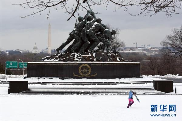3月14日,在美国首都华盛顿,一名拿着雪板的女孩经过海军陆战队纪念碑。 3月13日晚至14日,暴风雪袭击美国东北部地区。受其影响,该地区的数千航班取消,大部分学校停课。 新华社记者 殷博古 摄