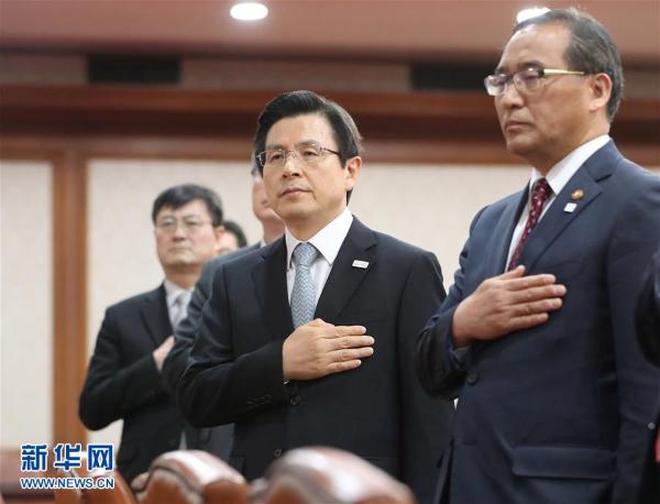 3月15日,在韩国首尔,代行总统职权的国务总理黄教安(右二)在内阁会议上向国旗致敬。韩国代行总统职权的国务总理黄教安15日宣布,韩国总统选举将于5月9日举行,以选出前总统朴槿惠的接任者。 新华社/路透