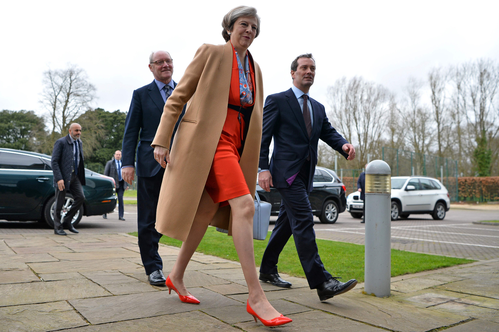 当地时间2017年3月17日,英国卡迪夫,英国首相特蕾莎·梅红裙配红高跟出席保守党春季大会。