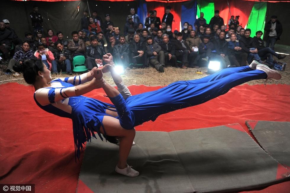 2017年3月16日,安徽淮南市大通区上窑洞山庙会上,来自安徽涡阳县的亚美亚杂技歌舞团团长杨亚美(左)参加杂技演出。