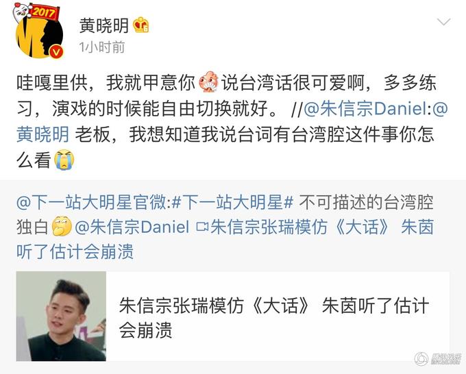 作为颜好腿长爱运动演技佳的下一站大明星优等生,在最新的一期节目中,朱信宗面对突发考验却因台湾腔受挫,在节目中未能精彩发挥。节目外,朱信宗还是心心念念着自己的短板,在微博上喊话向自己的老板黄晓明求助,语气撒娇软萌。黄晓明随后回应“哇嘎里供,我就甲意你,说台湾话很可爱啊,多多练习,演戏的时候能自由切换就好”,语气里一贯的温柔理解十分有爱。