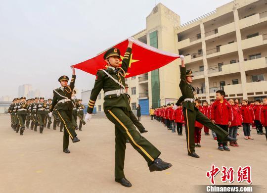国旗护卫队在山西孝义一农村学校进行义务升旗。 赵泉 摄