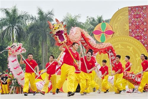 来自宾阳县的炮龙、马山县的草凳龙、青秀区长塘镇的芭蕉香火龙……各舞龙团队伴着响亮明快的音乐卖力地挥舞、快速地奔跑、敏捷地穿梭,或腾跃,或滚动,或盘起,或穿插,不断地展示扭、挥、仰、跪、跳、摇等多种姿势。巨龙上下穿行,时而腾起,时而俯冲,变化万千,充分展示了龙的精气神韵,群龙舞动将“壮族三月三”的喜庆氛围推向高潮。