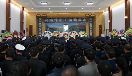 4月16日上午,河南漯河市公安局召陵分局案侦大队民警王清华遗体告别仪式在漯河市殡仪馆举行。河南省公安厅政治部,漯河市、召陵区党政机关,市县区政法系统和社会各界群众代表千余人前来送别。