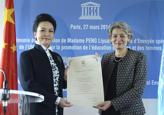 2014年3月27日,彭丽媛在巴黎联合国教科文组织总部被授予“促进女童和妇女教育特使”荣誉称号。从博科娃总干事手中接过证书后,彭丽媛说,这是一项崇高的事业,我愿意尽我所能,帮助更多孩子,为更多姐妹争取接受教育的权利。