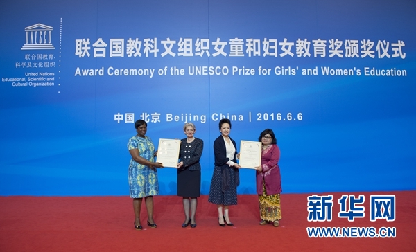2016年,彭丽媛和博科娃共同出席在北京举办的首届颁奖仪式并为来自印度尼西亚和津巴布韦的获奖者颁奖。对此,彭丽媛表示,女童和妇女教育奖是联合国教科文组织在这一领域设立的首个也是目前唯一的奖项,目的是通过奖励为推动女童和妇女教育事业发展作出杰出贡献的个人和机构,鼓励更多人投身这项事业。