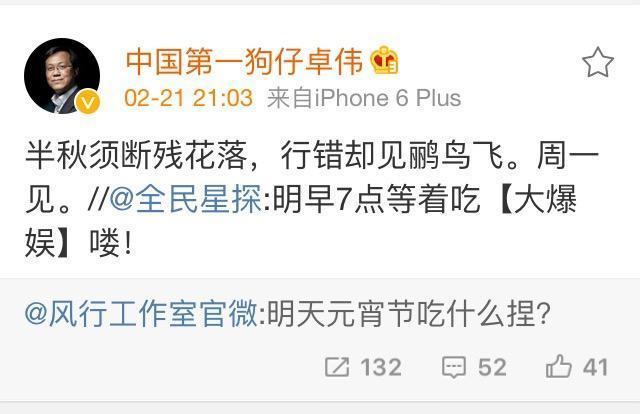 几分钟后,深谙公关原则的卓伟就在自己的微博上第一时间回应:“我很好,风行还在,周一见,还有料。”