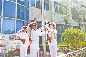 5日,昆明市五华区春城小学少先队国旗护卫队交接班仪式暨军训汇报展示活动举行。训练了半年的少先队国旗护卫队,从老国旗班队员手中接过国旗,正式承担学校的升旗任务。