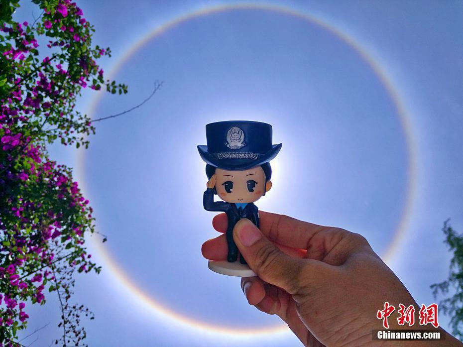贵州多地日晕景象。日晕也叫圆虹,属于大气光学现象。是日光通过卷层云时,受到冰晶的折射或反射而形成的。当光线射入卷层云中的冰晶后,经过两次折射,分散成不同方向的各色光。日晕是一种比较罕见的天象,分为全晕圈和缺口晕。日晕的形成与高云中的卷层云有密切的关系,卷层云的存在是形成日晕的必要条件之一。离地5000米以上的高空中是卷层云“生活”的地方,当它“靠近”太阳和月亮的时候,可以形成幻日和月晕。蒲文思/文陈昊/摄