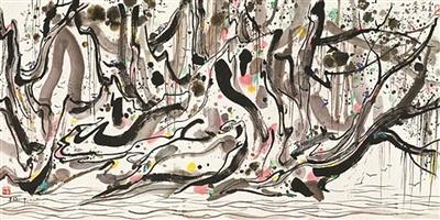 从实到虚,从具体到抽象,需要一个心理的内化过程。在吴冠中的艺术天堂里,他把物象本身的美抽离出来,将构成榕树与小鸟的美的因素和条件抽离出来,那就是表现在他作品中抒情婉约的线和灵动激越的点。这些线与点虽然来自于物象,但是他概括、发展、提炼了这些美的因素,又完全脱离了具体物象,而以构成绘画的抽象元素存在,因此他的画面现代感十足,犹如儿时的万花筒一般,千变万化,构成了抽象的天堂。