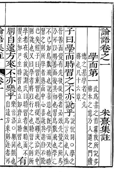 读《集注》还要了解朱子注的体例。关于《集注》的体例,朱子的儿子朱在曾作过详细的说明:“《集注》于正文之下,止解说字训文义,与圣经正意。如诸家之说,有切当明白者即引用,而不没其姓名。如《学而》首章,先尹氏而后程氏,亦只是顺正文解下来,非有高下去取也。章末,用圈而列诸家之说者,或文外之意,而于正文有所发明,不容略去。或通论一章之意,反复其说,切要而不可不知也。”(朱彝尊《经义考》卷217)在读注释时一定要分清层次,弄清哪些是引文,哪些是朱子的话。