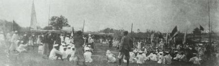 这是一张记录1925年“全川学生联合运动会”的珍贵照片。当年4月8日,四川全省学生联合运动会在成都西校场隆重举行。飘扬的旗帜,热烈的场景,欢快的大中学生——一场难得的体育盛会为动乱的四川留下了一抹霞彩。