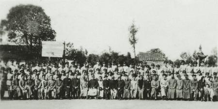 这张照片拍摄于1941年。1937年全面抗战爆发,不久国民政府迁往重庆,四川成为大后方,多地相继遭到日机狂轰滥炸。从1938年起,成都先后被日机轰炸31次。1939年,成都各级机关学校陆续疏散,其中四川省立成都高级工业职业学校(成都高工校)疏散到成都外东多宝寺办学。其时,条件极为艰苦:学生住茅棚,吃“八宝饭”,睡连通铺;没有教材手抄讲义,没有电用油灯照明,用手摇机床实习;学生进城需步行,老师进城要么步行要么坐鸡公车。在教师“不倦训诲”、学生“勤勉无懈”的努力下,一批批学生最终完成学业,投身国防建设,参加抗日斗争,报效国家民族。1941年,正值成都高工校在“困难万端”中初见成效之时,举办了一次校庆纪念活动,这张照片就是当时学生在操场上参加活动时留下的。