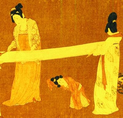 唐代画家张萱所绘《捣练图》中淘气的小女孩。
