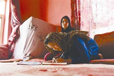 阿富汗首都喀布尔,女孩西玛跪在地上写字。