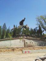 路上方绿树簇拥着伯乐相马雕塑:伯乐识出此马非凡,披衣与马,仰首捻须微笑,千里马幸遇知己,奋蹄腾空引颈长嘶,声如金石,直上云天。千里马下方卧一石马,无缘伯乐,一副郁郁寡欢的神态。