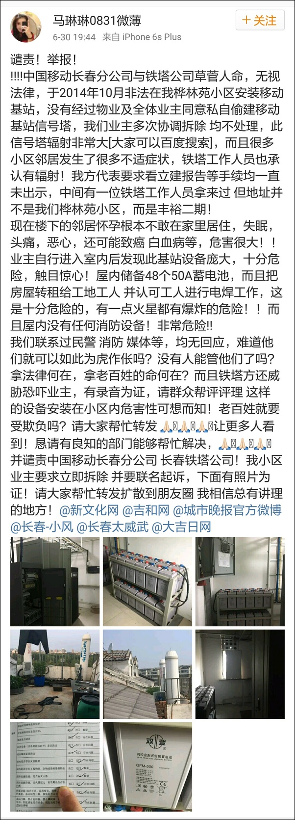 近日,微博网友@马琳琳0831微薄 发文痛斥中国移动长春分公司与铁塔公司,称其草菅人命、无视法律,未经业主同意私自偷建移动基站信号塔,由于辐射比较大,其所在小区很多邻居发生了不适症状、孕妇都不敢在家里居住。