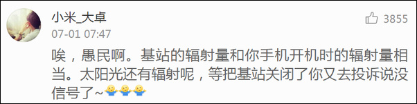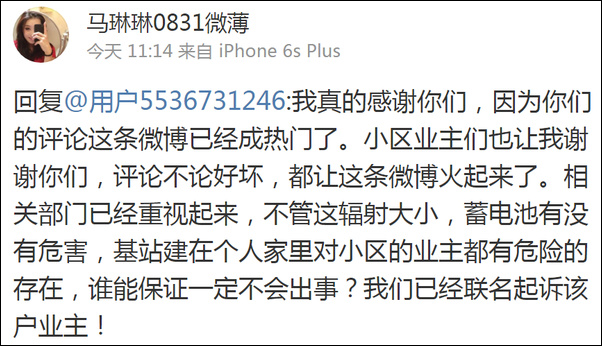 今天(7月2日),该博主在看到网友们的质疑后回复称,“不管这辐射大小,蓄电池有没有危害,基站建在个人家里对小区的业主都有危险的存在,谁能保证一定不会出事?我们已经联名起诉该户业主!”