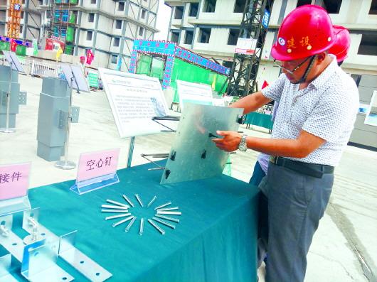 ▲7月7日,在嘉宁小区施工现场,技术人员介绍可拆底模钢筋桁架楼承板。□尹彤 报道