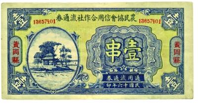 农民协会加盖黄冈县壹串(正面)