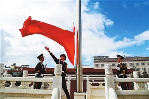 图为武警云南省总队迪庆支队官兵举行升国旗仪式喜迎中国人民解放军建军90周年。