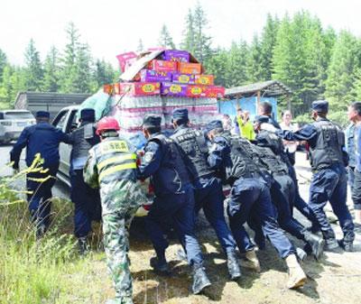 8月8日,四川省九寨沟县发生7.0级地震,多支救援力量赶赴震区开展救援。图为8月9日,在九寨天堂洲际大饭店停车场,救援人员合力将物资运输车辆推上斜坡。新华社发