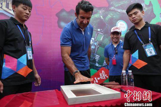 图为葡萄牙球星路易斯·菲戈在足球小镇留下手印泥。 贺俊怡 摄