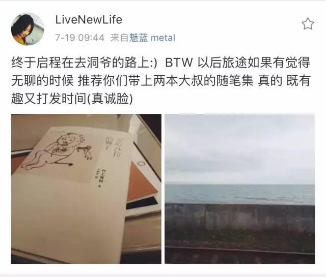 自由行最初的两天,她迫不及待在微博里分享了日本的街景、花海、自拍,还有随身携带的村上春树随笔集《爱吃沙拉的狮子》,书中写道: