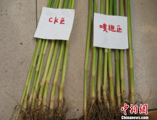图为:水稻在新型叶面肥喷洒前后对比图。 熊义勤 摄