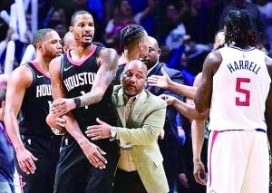 ▲火箭和快船的球员从场内打到场外。