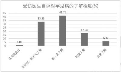 除了来自内科的两名称自己从未听说过罕见病,其余的各科室医生均表示对罕见病有一定的了解。认为自己“非常了解”罕见病的医生来则来自7个科目。其中,33.3%的耳鼻咽喉科医生认为自己非常了解。而参访人数最多的内科和儿科,只有6.2%和16.3%的医生有相同的自我评价。