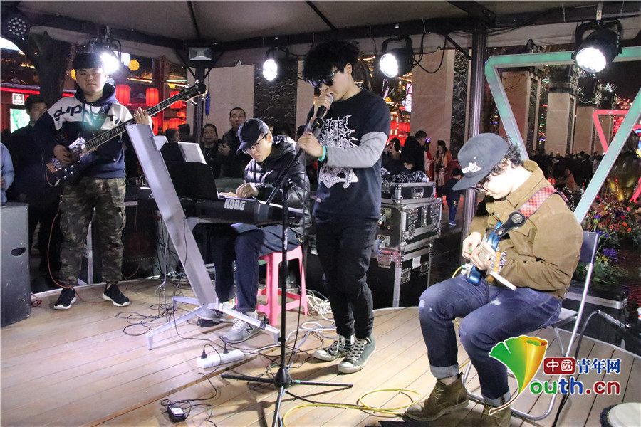 表演队伍中,一支来自“梦想艺术团”的摇滚乐队引人注目,他们是由陕西及西安外来务工青年组建的摇滚乐队。“进入艺术团三年了,我很喜欢舞台上这个氛围,喜欢观众的呐喊。从腊月二十八开始到现在,我们每天晚上从七点演出到凌晨十二点,感觉非常好。”农民工摇滚乐队主唱说。