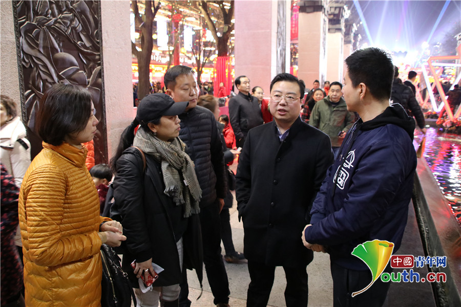 共青团西安市委副书记汪国栋(右二)在大唐不夜城“现代唐人街”新春文化庙会现场。高琦供图