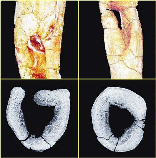 “肋骨上的这种情况通常是骨骼被侵蚀所造成的。”“为了进一步弄清楚这种侵蚀对肋骨造成的影响有多大,我们对肋骨进行了显微CT扫描,并进行了三维重建。结果显示,在恐龙肋骨内部也形成了空腔,这意味着这是一次深达骨髓的病变。”