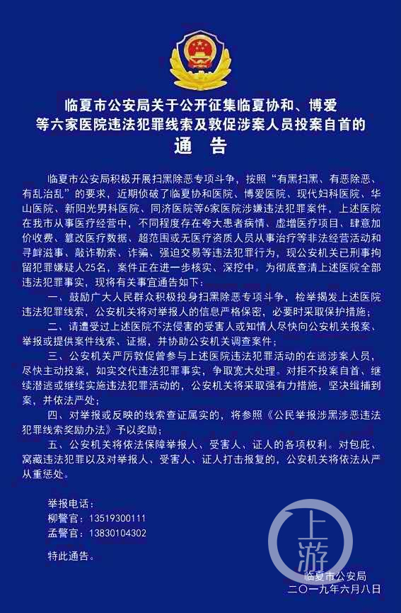 6月8日,甘肃省临夏市公安局发布《关于公开征集临夏协和、博爱等六家医院违法犯罪线索及敦促涉案人员投案自首的通告》。记者注意到,这6家医院均为临夏当地的民营医院。
