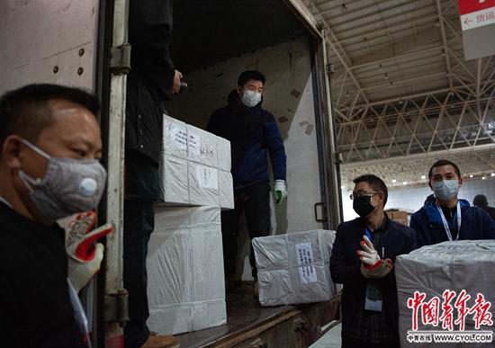 2月1日,武汉国际博览中心,临时被征用作仓库的展厅内,现场志愿者和邮政工作人员从一辆中国邮政邮车上卸下一批来自杭州的医疗物资,其中包括PCR检测系统等医疗设备。这里汇集了国内外援助物资,来自武汉各个投递点的邮政工作人员常驻现场,协助对物资进行装卸、分类和配送。中青报·中青网记者 李峥苨/摄