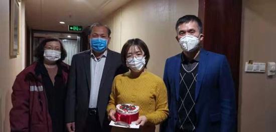 2月3日,辽宁援助武汉医疗队成员,大连医科大学附属第二医院何烨(右二)在武汉过了34岁生日。受访者供图