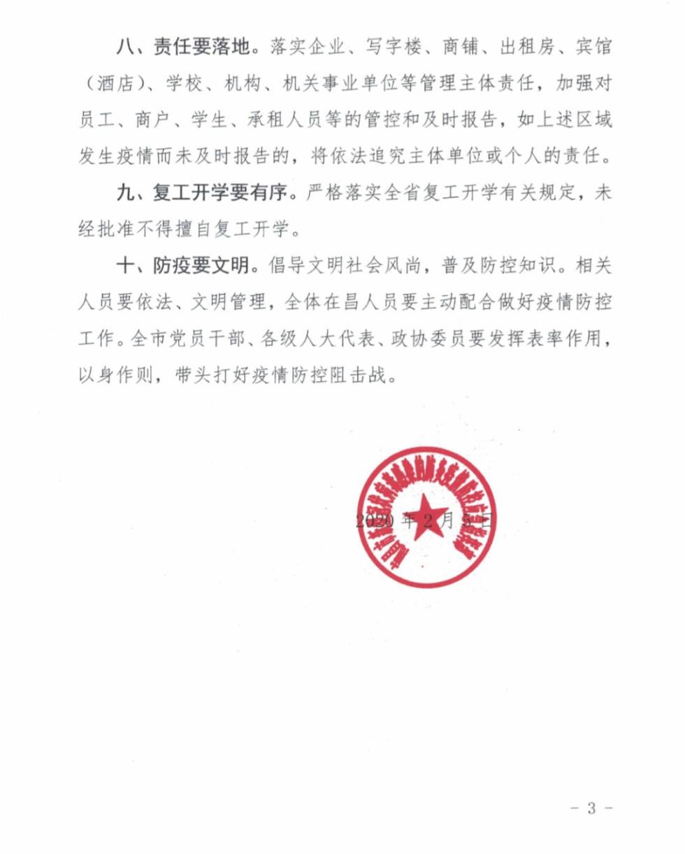 九、复工开学要有序。 严格落实全省复工开学有关规定,未经批准不得擅自复工开学。十、防疫要文明。 倡导文明社会风尚,普及防控知识。相关人员要依法、文明管理,全体在昌人员要主动配合做好疫情防控工作。全市党员干部、各级人大代表、政协委员要发挥表率作用,以身作则,带头打好疫情防控阻击战。